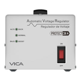 Regulador electrónico de voltaje marca VICA modelo PROTECT 3K, 3000VA/1800W, USO RECOMENDADO PARA LINEA BLANCA, 4 contactos NEMA 5-15R (4 tomas reguladas con supresión de picos) (entrada AC 5-15P) el disyuntor reajustable de alto voltaje y bajo, voltaje para protección contra sobrecargas Interruptor térmico incorporado para protección contra sobretemperatura, Indicadores LED, Entrada; Voltaje normal 120VCA, Frecuencia 60Hz, Rango de voltaje -20%/+25%, Salida; Rango de voltaje -10%/+10%, Interruptor de circuito de manual de reinicio, Interruptor térmico, 175 Joules, Dimensiones mm; 200x140x133, certificado NOM 001-SCFI-1993